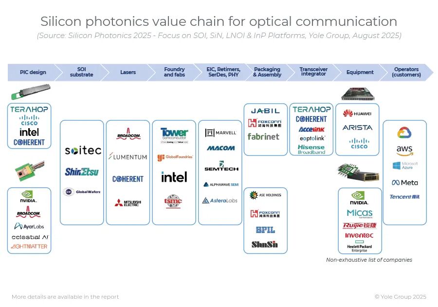 业界对硅光子技术所能创造的价值持乐观态度,产业生态呈现多元化格局。垂直整合巨头(如旭创科技、思科、Marvell、博通、Lumentum、新易盛)积极布局。