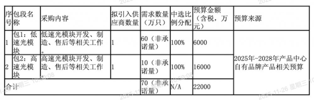 中国移动采购与招标日前发布终端公司2025年自有品牌光传输器件制造服务项目询比公告,采购内容为高、低速光模块开发、制造、售后等相关工作,需求数量70万只。
