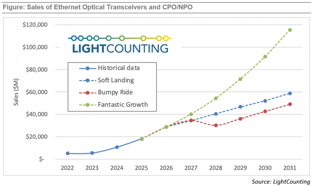 对于2027年-2031年的市场增长,存在更多不确定性。如图所示,“高速增长”(Fantastic Growth)可能会在2027年及以后持续。然而,2004年-2025年光模块销售的历史数据显示出一种周期性模式:2-3年的增长期之后会出现一个持平或负增长的年份。